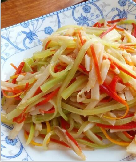 4。用红丝和生菜炒胡萝卜略带红色,然后翻炒;