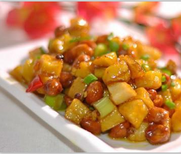 1杏鲍菇,50g花生,10种洋葱姜,10种辣椒,1茶匙芝麻油,20克干红辣椒,2汤匙糖,1汤匙醋,1茶匙盐,1茶匙淀粉,500毫升油